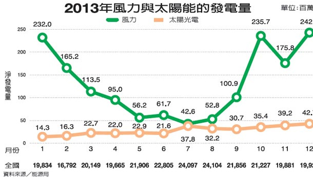 二○○九年通過再生能源發展條例,其中躉購制度,為民間投資綠色能源奠定基礎,一時間台灣再生能源的容量大躍進。截至去年十月,我國再生能源總裝置容量已達到三千七百六十點六MW,占總電力系統裝置容量百分之九點一,較二○○九年成長近百分之廿五。其中太陽能裝置容量為三百廿四點六MW,較二○○九年九點五MW,大增卅四倍,陸域風力已設置三百十一架風機,達可開發量七成,光是中彰以北沿岸,就有約兩百五十架風機。