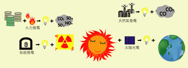 · 每kW的PV(太陽光電)每年可減少 9公斤氧化硫( SOχ )、16公斤氧化亞氮( NOχ )及2300公斤二氧化碳( CO2 )的排放(相較於礦物能源)。(資料來源:SOLAR-ELECTRIC POWER The U.S. Photovoltaic Industry Roadmap; p.10; 2001)
